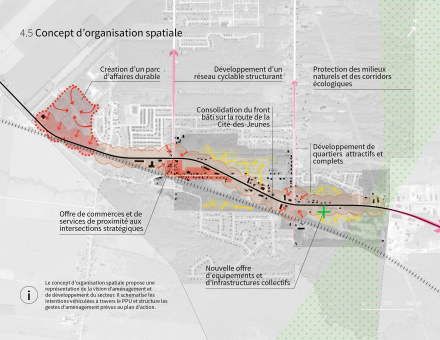 Le PPU du secteur de la Cité-des-Jeunes se distingue par sa volonté de dépasser une simple logique de développement pour proposer un véritable projet de milieu de vie. Il articule une vision d’ensemble fondée sur la structuration des futurs quartiers, la transformation progressive de la route de la Cité-des-Jeunes en boulevard urbain, l’intégration de seuils de densité adaptés, la protection des milieux naturels et la mise en réseau des espaces et équipements publics. Il est fondé sur un cadre d’aménagement précis, appuyé par un plan d’action, une stratégie réglementaire et des principes de design urbain permettant d’intervenir de manière cohérente et progressive. L’Arpent a accompagné la Ville de Saint-Lazare dans l’élaboration de ce cadre, en veillant à arrimer les intentions aux outils de mise en œuvre, afin que le PPU serve à la fois de référence stratégique et de guide opérationnel pour les décisions d’aménagement à venir.